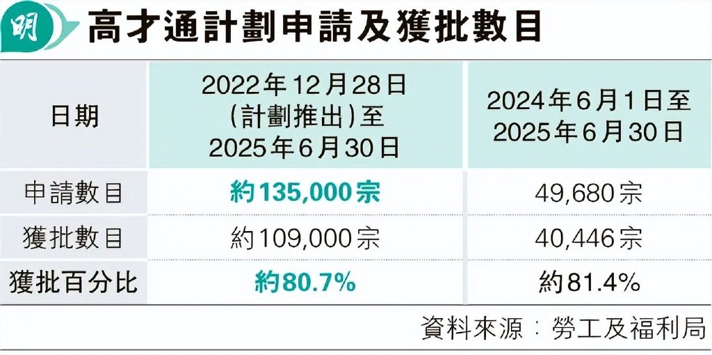 香港高才通计划作为香港"抢人才"战略的核心组成部分,旨在快速吸引全球高收入人士和顶尖大学毕业生来港发展,为香港经济注入活力。根据香港劳福局最新公布的数据,截至2025年7月底,香港高才通计划共收到近14万宗申请,其中约11万宗获批,整体获批率高达80%。