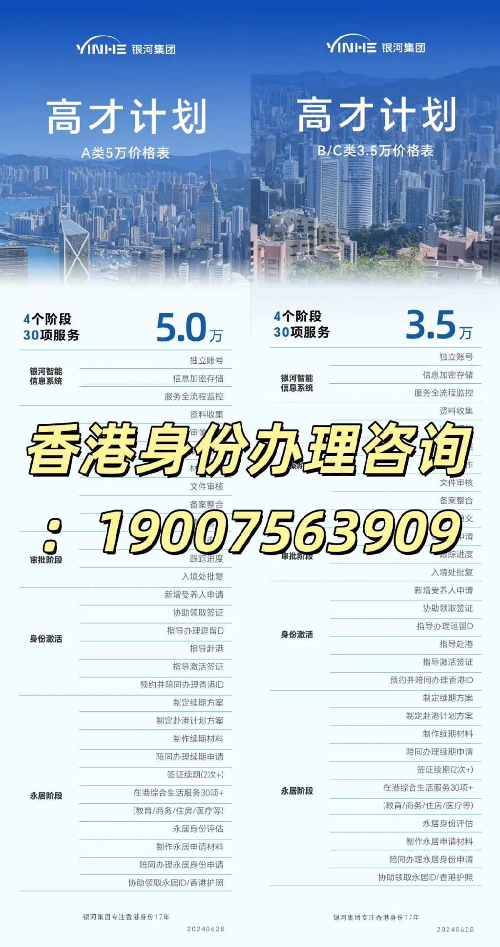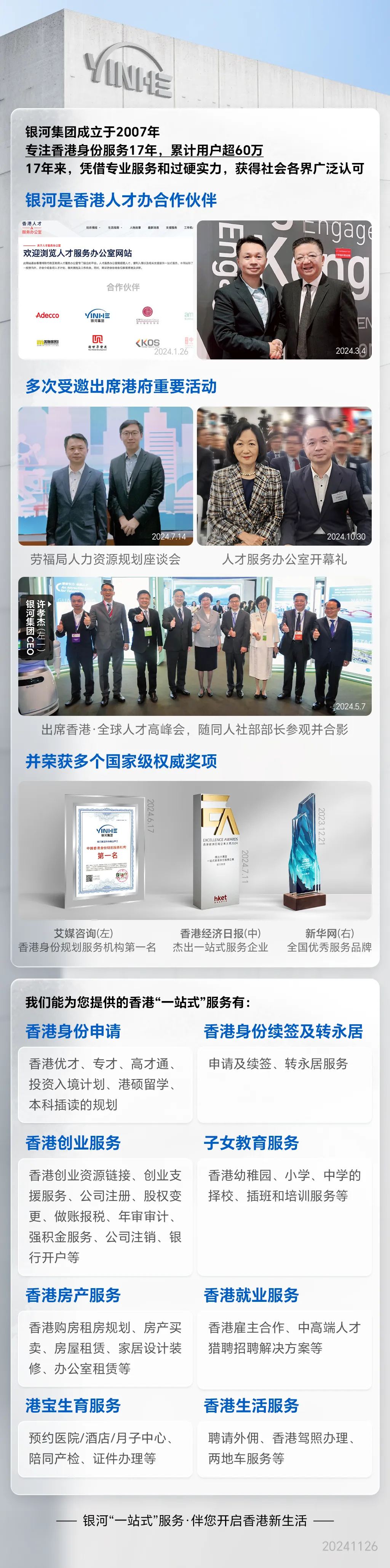 银河集团专注香港身份服务18年,也是香港人才办官网指定的长期战略性合作伙伴,银河可以为您提供香港身份规划(优才/高才/专才/留学/投资移民)一站式服务,7年全周期个性化定制香港身份申请及续签永居方案,银河专业服务咨询:19007563909(微信同号)。