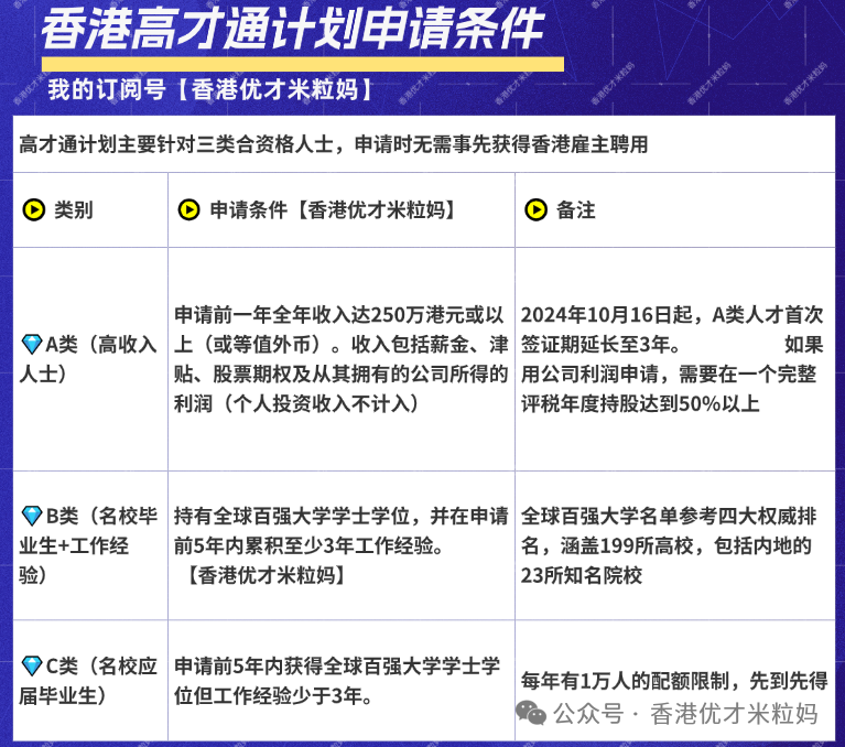01、香港高才通计划申请条件高才A类申请条件针对个人收入 申请在紧接申请前一年,全年收入达港币 250 万元或以上(或等值外币)的人士,需提供完税证明。 针对公司利润(5月政策有调整)
