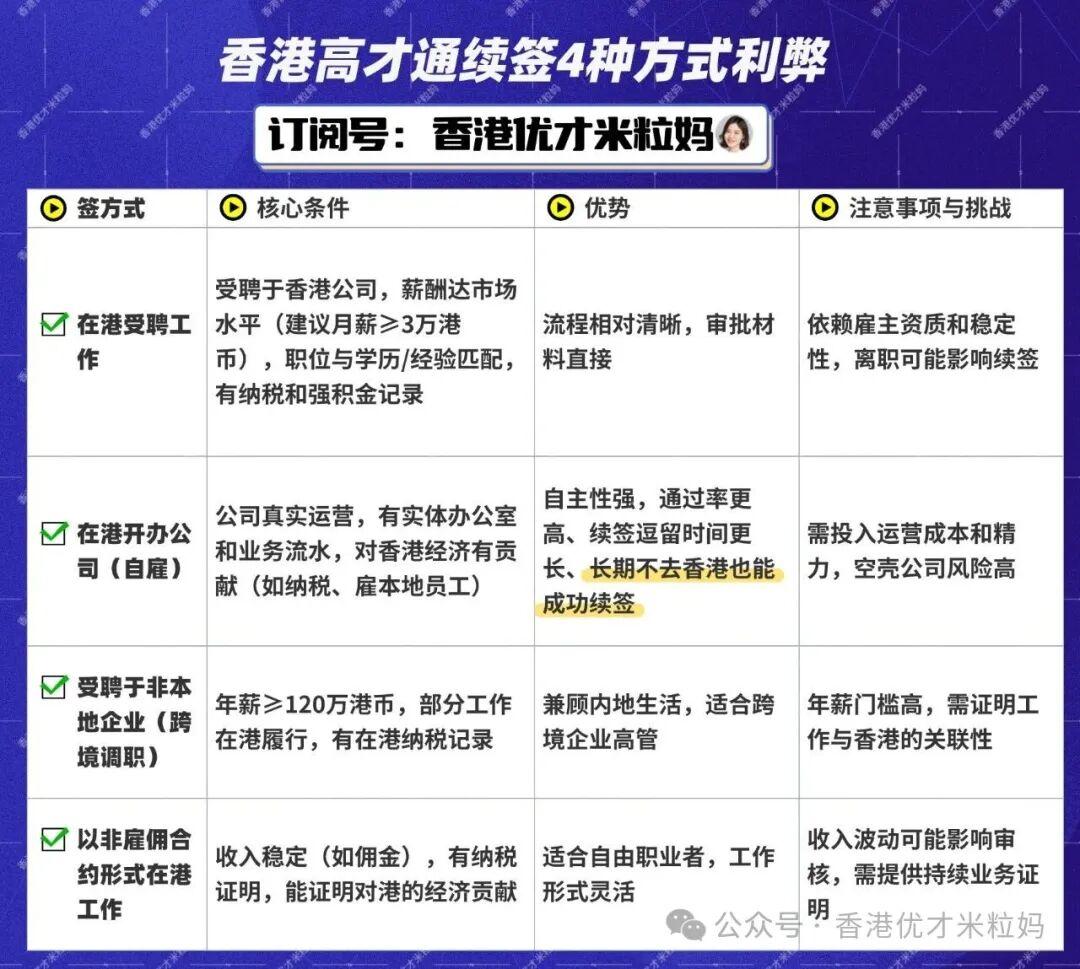 ✅高才通四种主流续签方式对比与选择高才通续签有4种方式:在港受聘工作、在港开公司自雇、跨境公司、自由工作。如果长期不去香港,可以选择创业续签。创业续签因为多种优势成为内地人士最受欢迎的续签方式,需要注意的是创业续签成本会比较高。