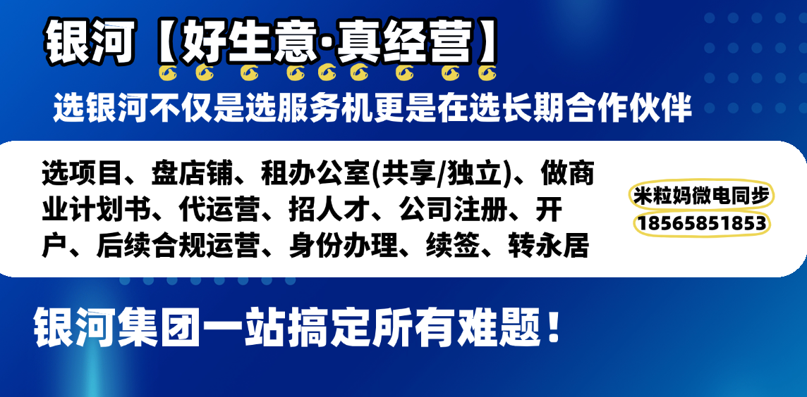 银河集团香港身份办理、创业和续签都找银河集团,从香港身份办理、选项目、收购店铺、租赁办公室、到后期招人、商务服务、公司代理运营管理,续签和永居手续办理, 银河集团全都帮您搞定。选银河不仅是选一个服务机构,更是选一个懂香港、懂创业、懂续签的长期伙伴!银河【好生意·真经营】=身份到手+创业成功+顺利续签转永居。想要了解银河集团【好生意·真经营】项目可以加银河米粒妈微信详细沟通(18565851853&17675416895)