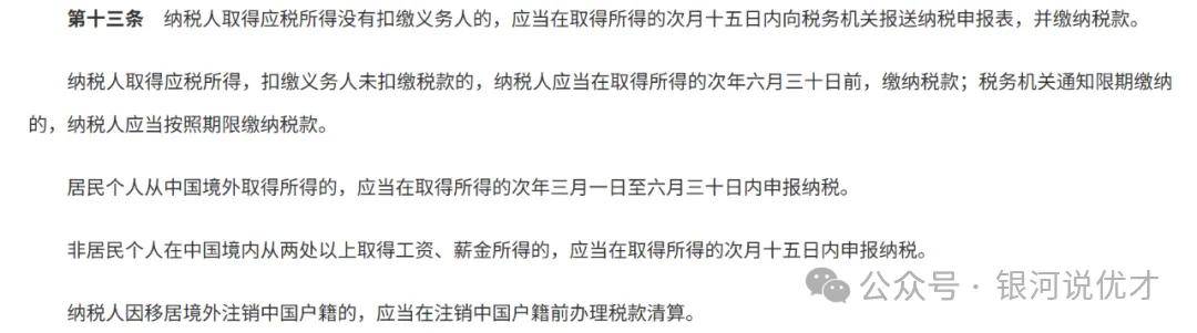 根据《中华人民共和国个人所得税法》第十三条:居民个人从境外取得所得的,应在次年 3 月 1 日至 6 月 30 日期间,办理年度汇算申报。